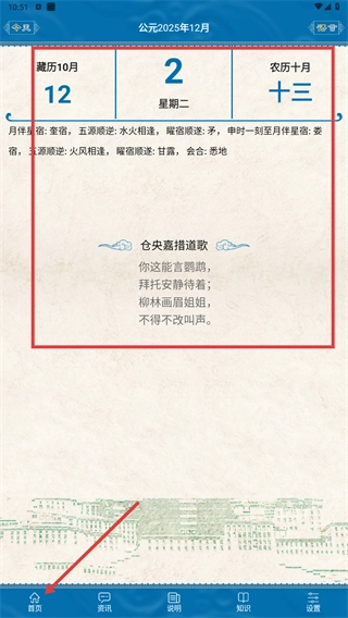 在首页界面,能够查看公历、藏历、农历的日期,还可以获取月伴星宿的相关信息以及仓央嘉措道歌的内容。