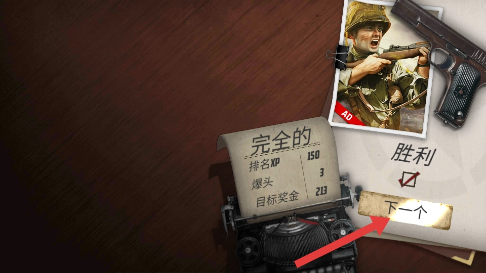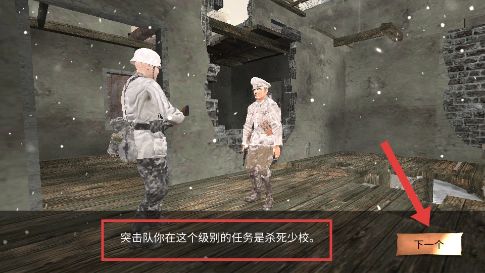 1、明确本次任务目标【突击队在该级别任务中的核心任务是消灭少校】,点击【下一个】按钮即可进入战斗环节。