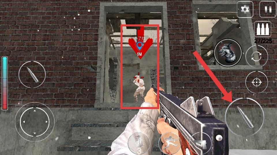 3、锁定标注有“杀了他”字样的目标,点击射击按钮将敌人消灭,从而完成击杀任务。