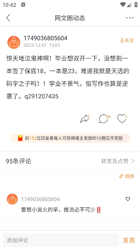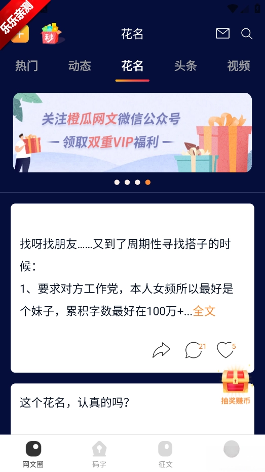 橙瓜是杭州道文网络科技有限公司打造的网络文学交流与创作平台,面向网络文学爱好者、作者及行业从业者。平台整合了码字工具、行业资讯、社交互动、小说阅读与数据查询功能,旨在构建一站式网络文学服务生态。在这里,用户能高效进行创作、交流经验、了解行业动态,还可畅享涵盖玄幻、言情、都市、科幻等全品类的阅读资源,支持按分类、字数、状态筛选作品,平台会依据用户喜好推荐“十年经典”“完结好书”等个性化书单,助力解决书荒;同时实时更新网文圈新闻、八卦及招聘求职信息,方便用户把握行业趋势;用户也能创建或加入兴趣社团,与同好分享创作心得,建立深度联系。