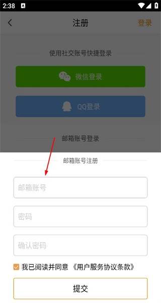 4、进入注册页面后,能看到社交账号快捷登录和邮箱账号注册这两个选项,填写好邮箱账号、密码等相关信息,点击提交按钮即可完成注册流程。