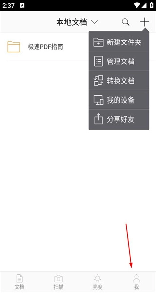 打开软件后,首页设有极速PDF指南、新建文件夹等功能选项,点击“我”按钮即可进入对应的个人中心页面。