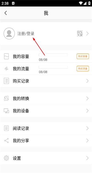 2、进入个人中心页面后,可看到注册登录、我的容量、我的流量等选项,点击“注册登录”即可进入对应的登录操作页面。