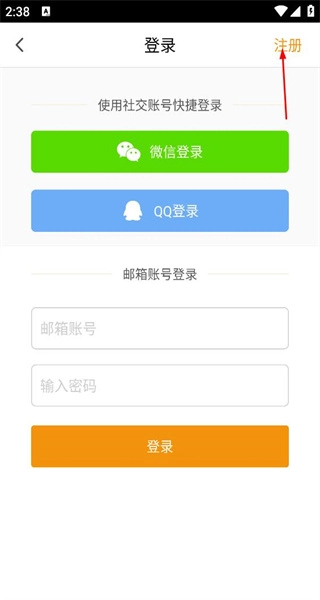 3、进入登录界面后,可看到微信登录、QQ登录、邮箱账号登录等多种方式,点击注册按钮即可进入相应的账号注册操作页面。