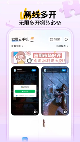 1、傲晨云手机可实现一部设备具备多台手机的使用效能,无论何时何地都能实时监测所有应用的运行状态,带来接近真实手机的操作感受,哪怕是紧张刺激的对战场景也能从容应对。
