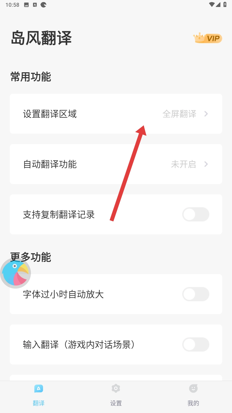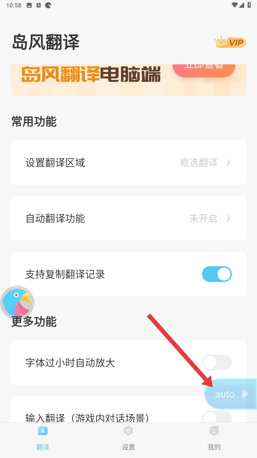 4、我们可以点击悬浮球上的【auto】按钮,这样就能开启自动翻译功能,游戏内容就不会再让人感到疑惑啦。