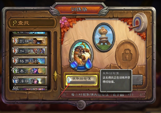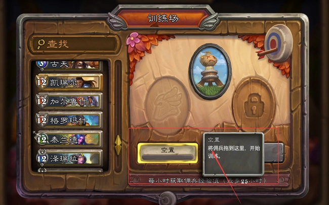 1、玩家进入《炉石传说:佣兵战纪》后前往训练场,按下图所示操作,点击想要换下的己方佣兵,完成该操作即可获取该佣兵对应的经验值;