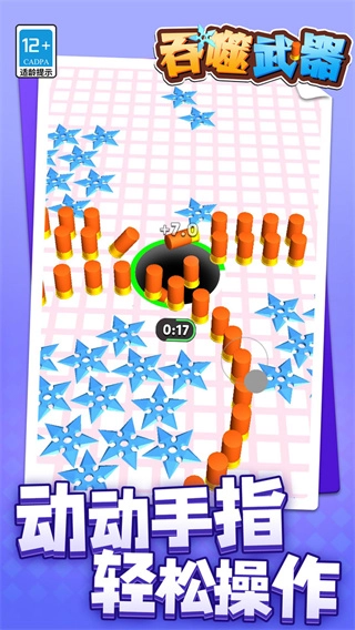 1、进入游戏后滑动控制黑洞移动,吞掉场上的各种武器,让黑洞逐渐变大,能吞掉更多的子弹。