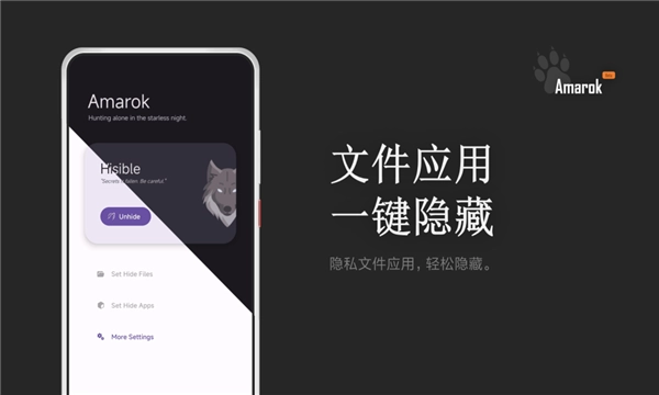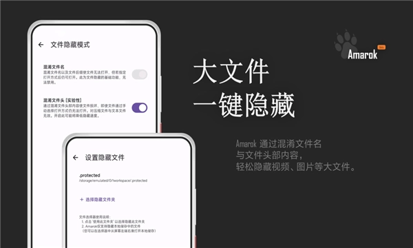 这是一款轻量级隐私保护工具,它不通过加密文件与应用来实现保护,而是采用“隐藏”的方式——不加密文件内容,仅对文件名和文件签名做混淆处理,让文件呈现“损坏”状态无法正常打开,同时将其隐藏起来。Amarok对应用的“隐藏”则是通过停用应用来实现,使这些应用在启动器里无法被看到。但需要特别注意的是,它并非加密类程序,隐藏后的文件很容易被复原,因此请不要用Amarok来保护重要的文件或应用!