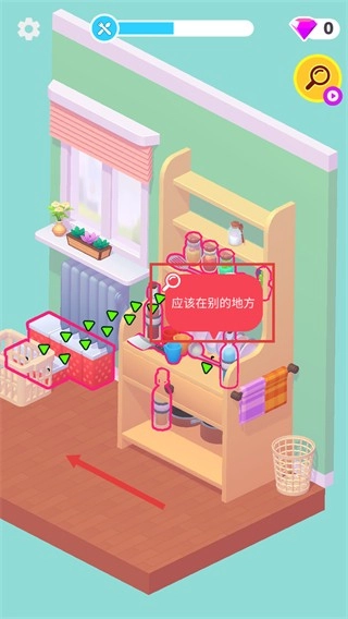 2、继续整理物品,点击放大镜,会提示你放置正确的地方,优化置物架布局。
