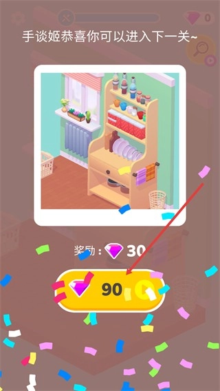 4、通关后获取奖励,确认奖励信息后即可进入下一关,继续进行物品整理挑战。