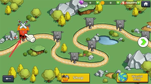 1、在世界地图界面点击标有“1”的关卡图标,进入关卡1的战斗准备界面。