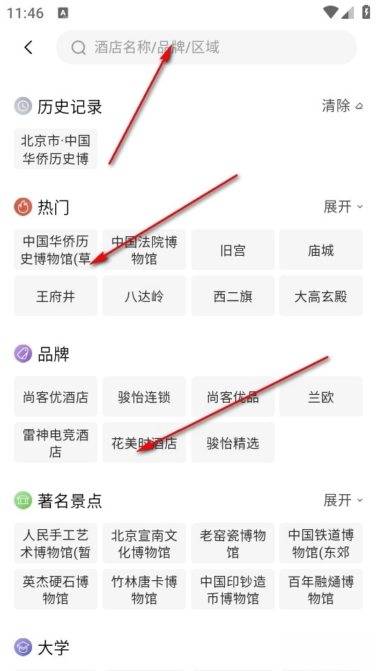 搜索自己的所在区域或者酒店的名称和品牌。