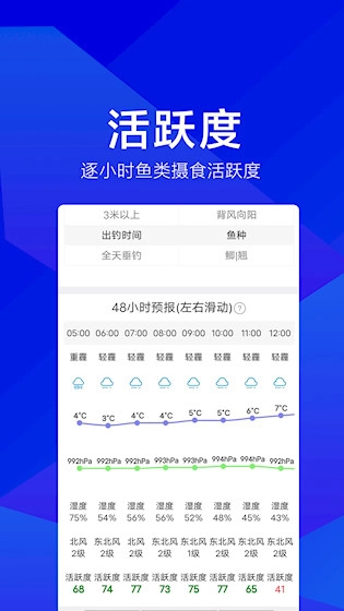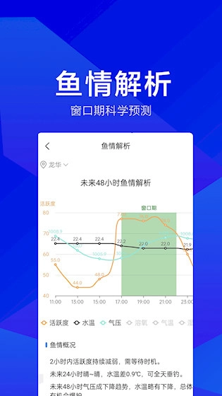 2、天气分析:综合温度、气压、水温等自然因素,对鱼情进行预测,生成直观的钓鱼指数,辅助用户选择最佳出钓时间。