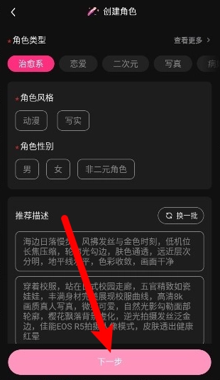 5、进入后选择角色类型、风格、性别,输入描述后点击"下一步"根据提示创建角色。