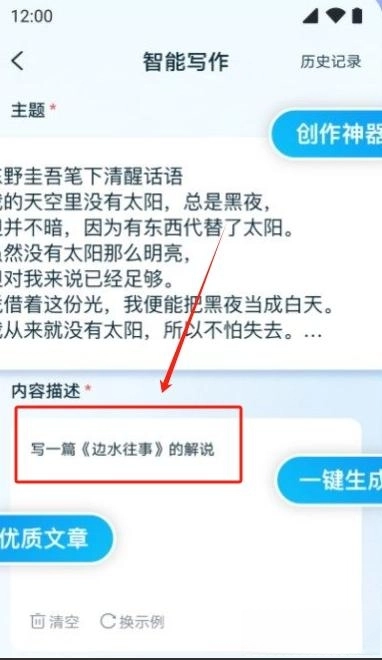 u200c3、输入主题与请求u200c:输入您想要写作的主题和具体要求,以便机器人更好地理解您的创作意图。