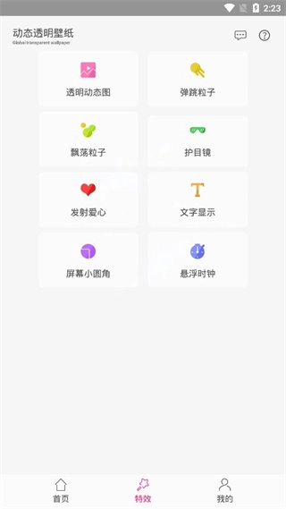 1、打开动态透明壁纸点击首页选项进入软件主界面,进入软件主界面浏览各类功能设置和资源内容展示列表。