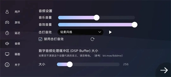 玩家能够在音频设置相关功能区域,对游戏过程中的声音大小进行调整,同时还可以对音频处理所涉及的缓存区间数值进行测试与设定。