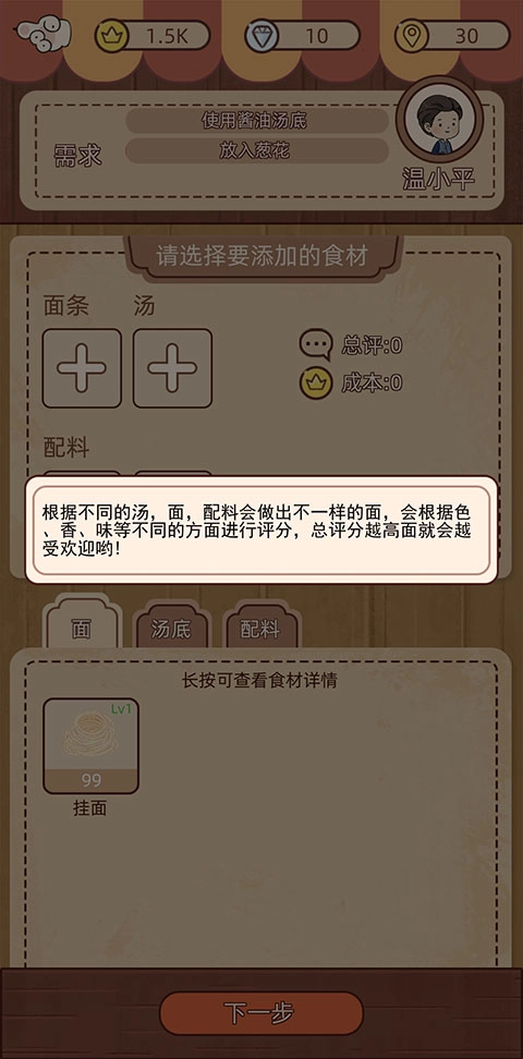 挑选想要加入的食材,依据汤品、面条种类以及配料的差异,能制作出风格各异的面食;系统会从色泽、香气、味道等维度进行评价,得分越高,这款面食的人气往往也越高。
