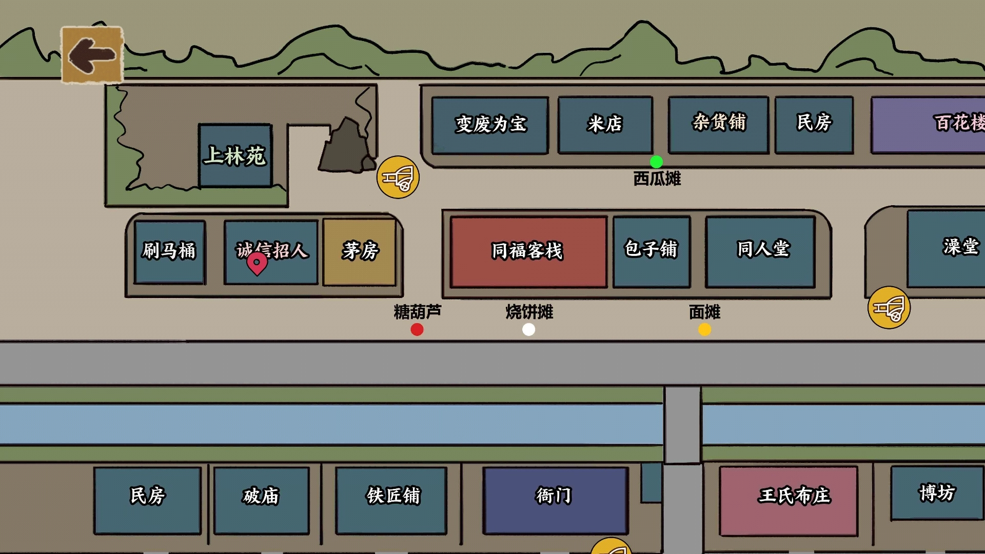 进入地图界面后,便能查看自己当前所处的位置,以及游戏里各个场景和摊位的具体地址。