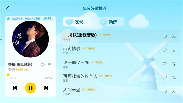 酷我音乐电视版是北京酷我科技有限公司专门为智能电视打造的一款电视端音乐影音播放软件。用户通过遥控器就能在软件里听歌、点歌,还能在电视大屏上欣赏高清音乐MV。软件配备了热门音乐榜单、主题电台、歌词同步显示等多种功能,以及大屏专属的操作界面。另外,软件的手机账号与电视账号是互通的,使用起来非常方便。