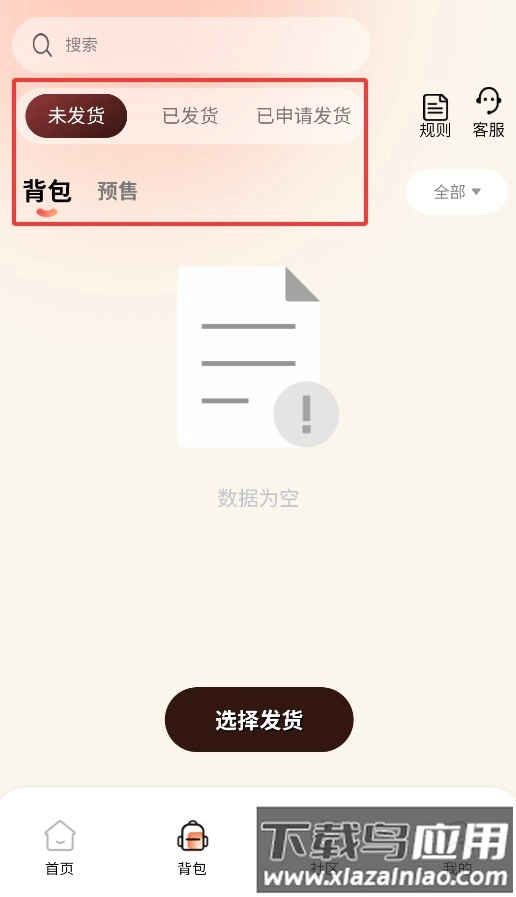 3、借助“背包”功能能够查看商品状态,涵盖未发货、已发货以及已申请发货的订单;