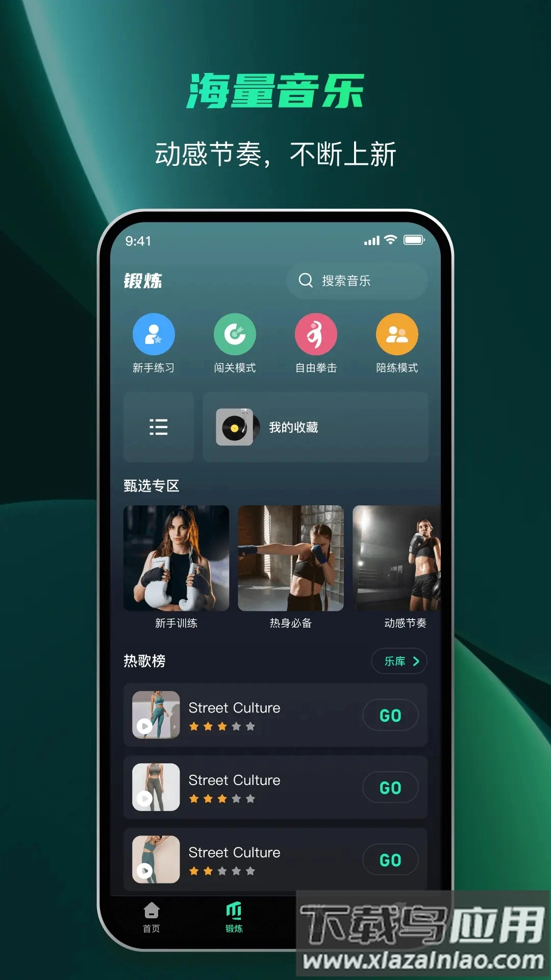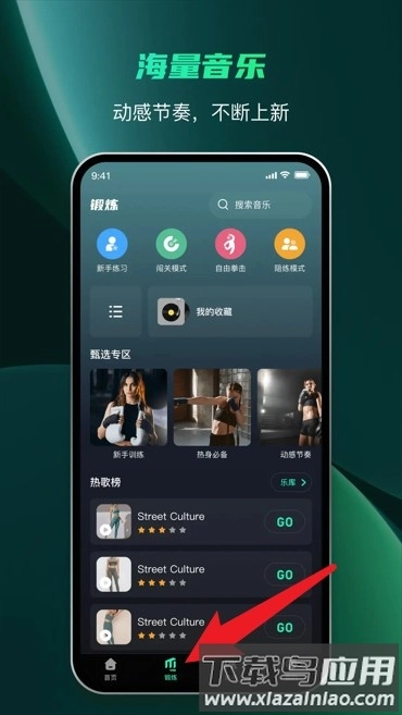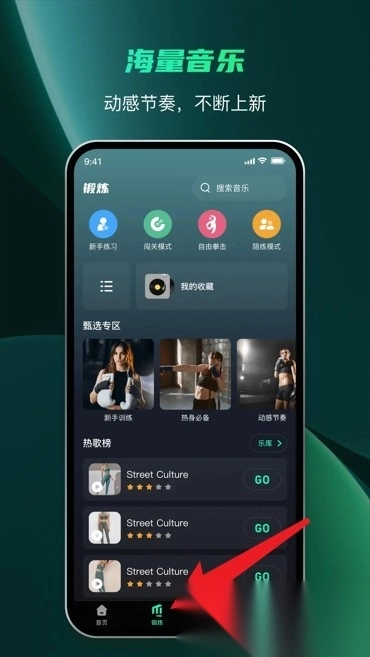 2.锻炼首页设有丰富的音乐节奏选项,同时支持自定义训练模式和收藏常用设置,能更好地贴合个人使用偏好。