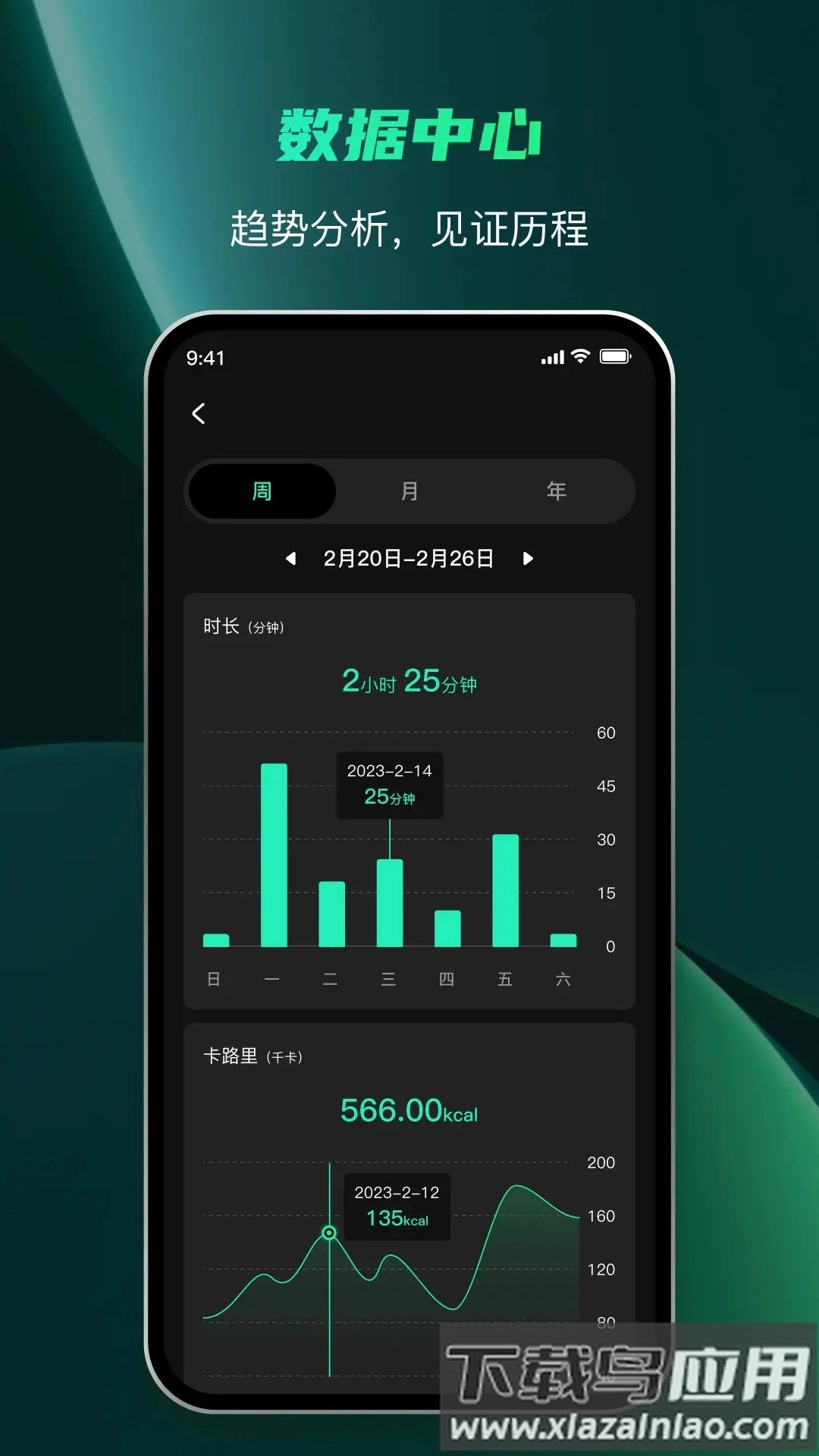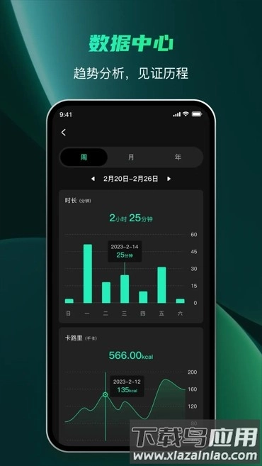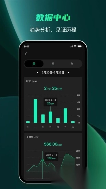 4.数据中心会清晰记录每日的训练时长以及卡路里消耗情况,并借助趋势图来直观地展示用户的进步轨迹。