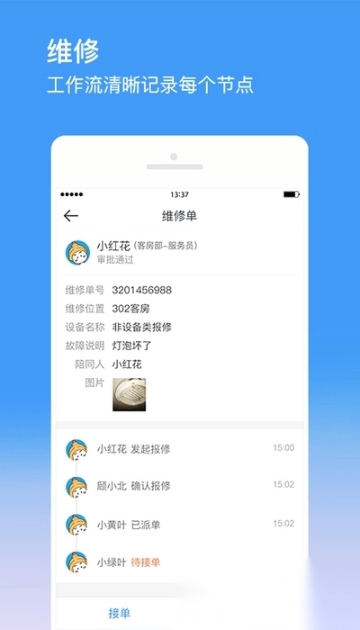 3. 【维修】对维修的全流程与实时进度进行完整记录,提供多种报修及派单模式供选择,同时允许用户根据实际需求自定义维修环节。