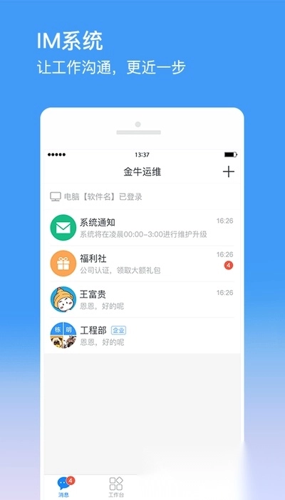 金牛运维是一款专业的设备维护管理软件,旨在提升工作效率。借助这款应用,用户可以实时在线沟通,及时了解管理动态,高效协调工作、跟进任务,优化管理流程,还能随时查看工作进度。若有需要,可前往鸟进行安装。