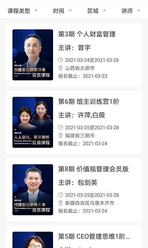 1、可实时查询全国范围内线下课程的排期情况,并且支持依据地域或主题进行筛选;