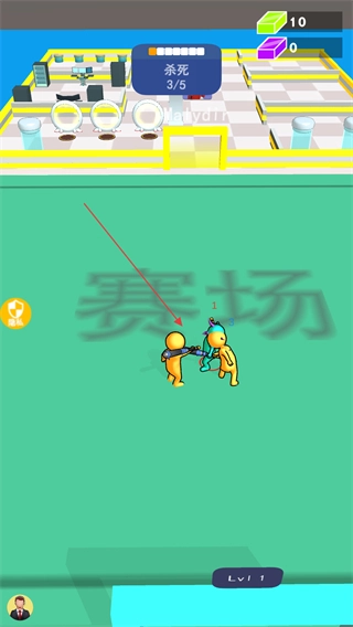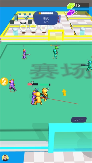 在赛场上攻击其他颜色的火柴人,每击败一个敌人,任务进度就会推进到1/5,与此同时要留意自身的等级情况。
