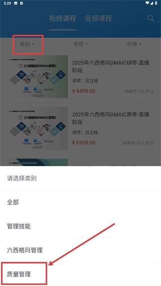 在课程筛选页面,点击【类别】下拉菜单,选择【质量管理】类别,即可筛选出该类别下的相关课程。
