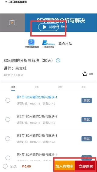 4、进入课程详情页面后,点击【试听】按钮就能体验课程内容,也可以通过【加入购物车】或者【立即购买】这两个选项来完成课程的选购操作。
