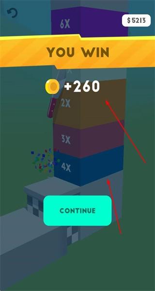 当关卡挑战成功完成后,会获得金币奖励,此外还有倍数标识,这或许代表奖励倍数,之后可以点击CONTINUE来继续游戏。