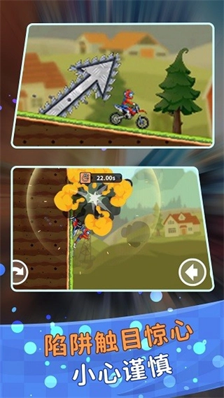 当行驶至带有坡度或需跳跃通过的路段时,要合理按压前进按钮,以此来控制摩托车的速度以及跳跃的时机。