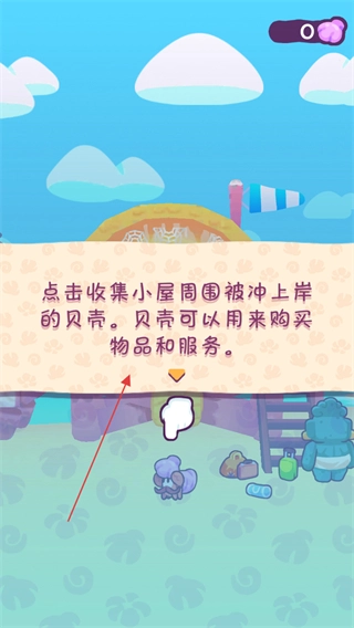 进入游戏后,按照提示点击收集小屋周边被海浪冲上岸的贝壳,屏幕右上角会实时显示已收集的贝壳数量。
