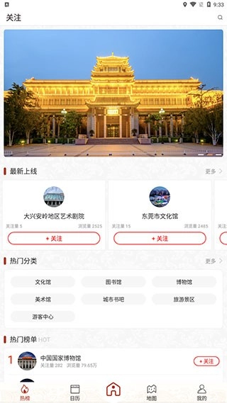 在本站完成国家公共文化云的安装并打开后,映入眼帘的便是软件的热榜页面。在这里,你能浏览到全国各地的文化馆信息,页面主要分为热门分类与热门榜单两大板块,方便用户快速查找所需内容。同时,你还可以对自己感兴趣的文化馆进行关注,这样就能及时获取它们发布的最新动态了。