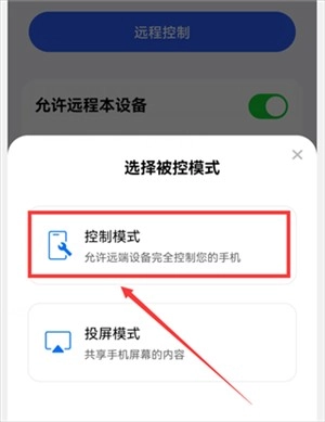 点击“允许远程本设备”右侧的开关后,底部会弹出“选择被控模式”的弹窗(见下图)。