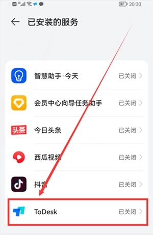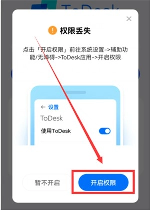 点击ToDesk选项右侧的开关,将其开启至蓝色状态(见下图),这样另一部手机的设置就完成了。