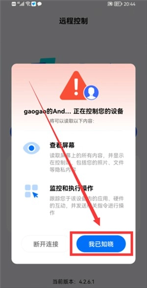 在密码输入完毕后,点击“连接”按钮,此时,另一台手机的屏幕上会出现一个提示界面,显示“XXX正在控制你的设备”(相关界面如图所示)。
