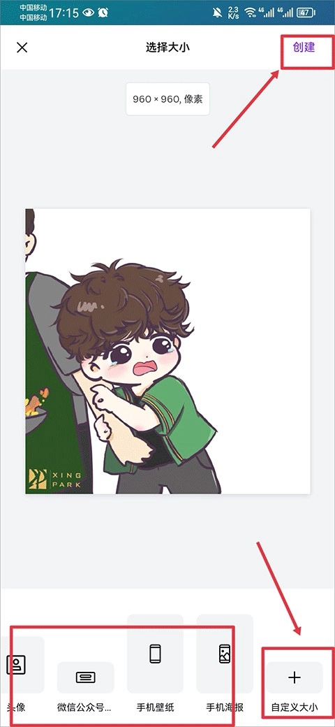 在相册里选好照片后,下一步是确定图片尺寸。要是预设的尺寸都不合心意,能点击自定义尺寸选项来调整。等尺寸设置妥当,点一下创建按钮就完成了。