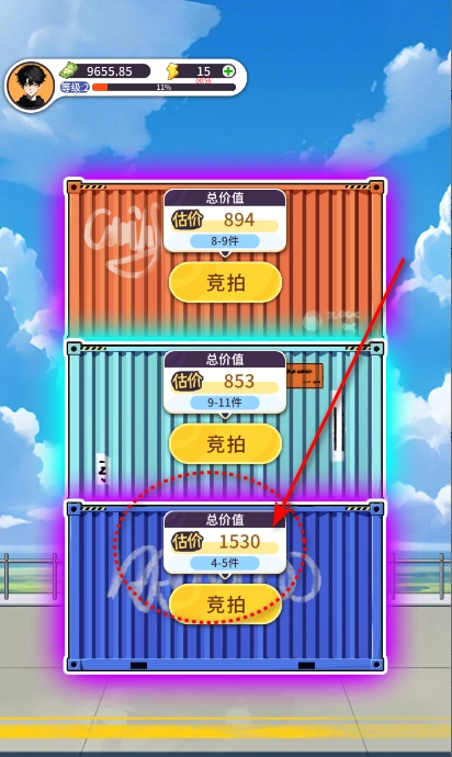从玩法上来说竞价的方式来获得集装箱的物品,从游戏竞价成功到出售物品的过程我觉得也是有些问题的,一开始玩还勉强可行但是后面操作下来感觉基本不用任何策略的操作,只是简单点击售卖获得这差价,这种经营套路来说都是比较普遍的存在,玩起来真没有多少亮点可言,而且本身游戏中还有不少广告设计并且是必须看的,而且最恶心有些广告点进去看既然卡bug开始倒计时间还正常没几秒直接停止倒计没法完成,单从这些问题来说就很难让玩家长时间玩下。