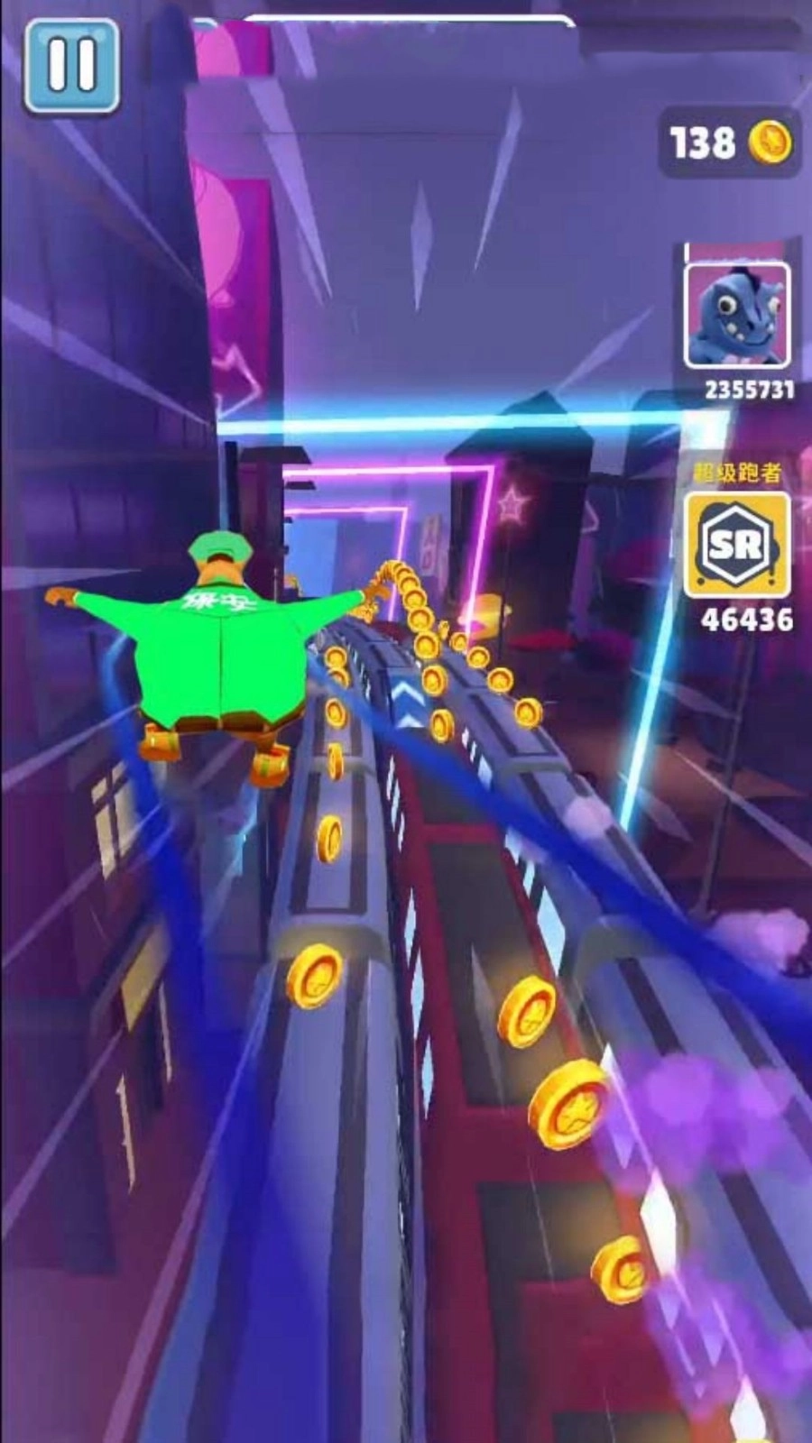 在奔跑时,要不断收集蓝色能量瓶来保持加速状态,还要搜集金币,用它们购买道具和解锁新的角色外观。
