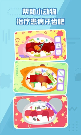 多多小牙医是一款专门为儿童打造的启蒙教育游戏,孩子们在游戏里能化身全能小牙医,走进多多的牙科诊所,帮助候诊的可爱小动物们处理口腔问题。