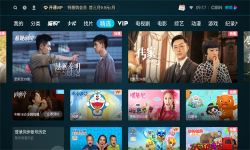 进入主页后,左上角能看到CIBN的标识,右上角除了显示时间信息外,还设有“设置”和“儿童锁”两个功能按钮。主页的核心内容主要围绕当下热门的影视节目展开。