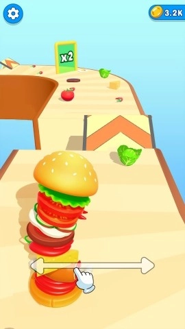 赛道上到处都是各种各样的新鲜食材,你得灵活地控制角色一路狂奔,在躲开障碍的同时,尽量收集到更多食材,好为制作汉堡做准备。