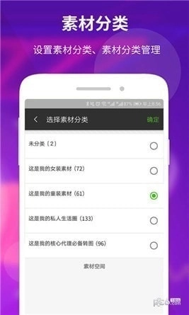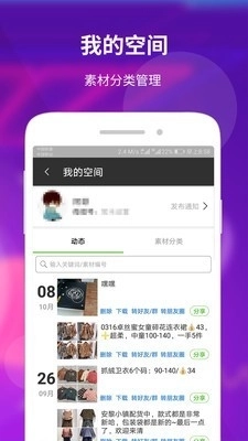 用户能够对自己发布的素材进行分类,像“这是我的童装素材库”“这是我的女装素材库”“这是我的私人生活圈”之类的分类方式都可以。