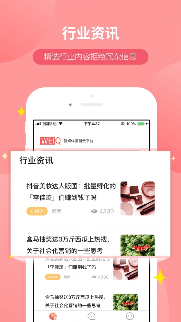 WeiQ自媒体应用是社交领域中一个低成本且高效率的网络交流平台,其目标是为不同行业提供精准的社交自媒体内容自助交付服务。该应用能够为用户呈现丰富的行业资讯,提供相互推广的机会,从而有效进行推广并增加真实粉丝数量。