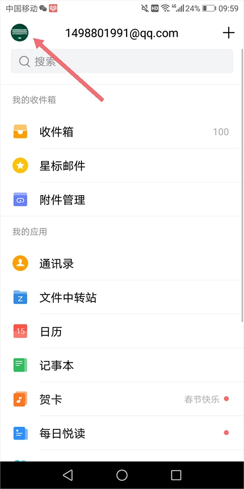 1、用户进入QQ邮箱页面后,可点击顶部左上角的QQ头像或微信头像(下图红色箭头所指区域)